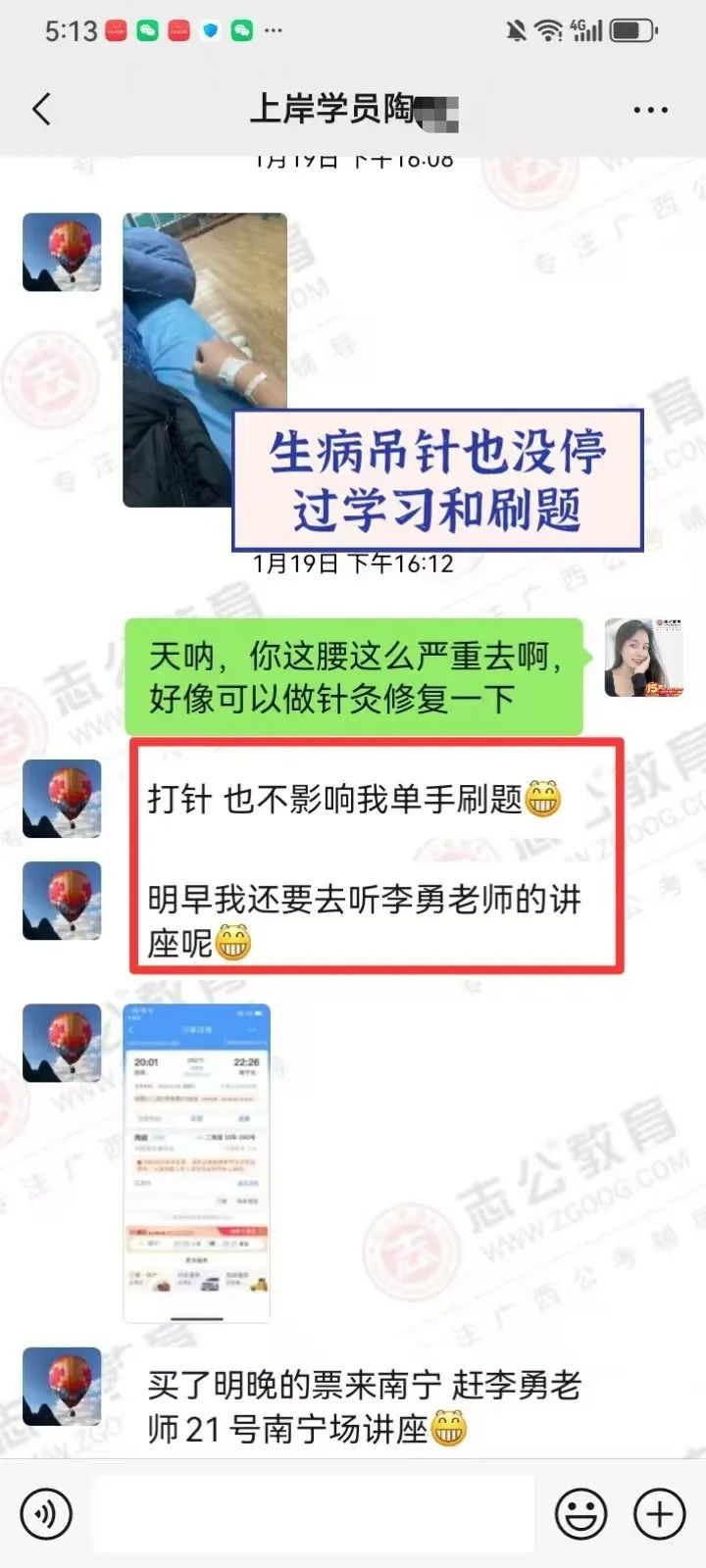 在備考的日子里,無數(shù)個(gè)夜晚,我看到他朋友圈發(fā)的經(jīng)常學(xué)習(xí)練習(xí)到教室關(guān)門最后一個(gè)才回家,無數(shù)次往返南寧和桂林兩座城市,只為家庭和研究生學(xué)業(yè)和公務(wù)員備考的有序進(jìn)行,讓我印象最深的一次,就是他微信拍了一張正在打針輸液的照片發(fā)給我,還打趣的跟我說:還好不影響我單手刷題! 即使學(xué)員因?yàn)樯眢w過于勞累導(dǎo)致生病在吊針,也絲毫沒有懈怠過學(xué)習(xí),讓我非常的佩服和感動(dòng)。