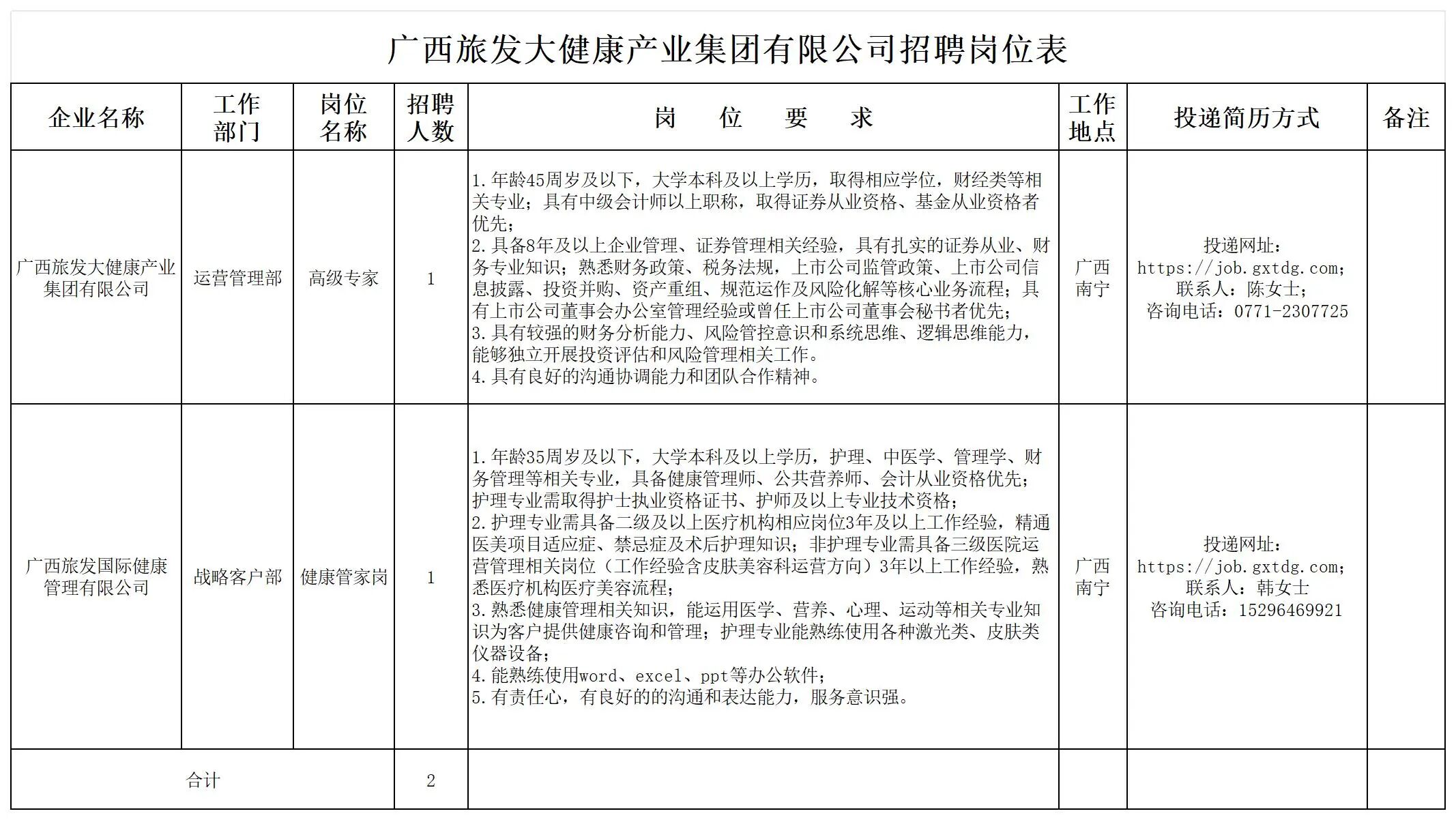 廣西旅發(fā)大健康產(chǎn)業(yè)集團有限公司有關(guān)崗位員工2名(詳見(jiàn)招聘崗位表)。