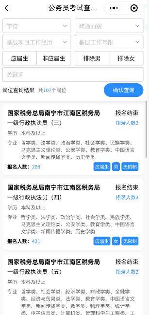 如對【國家稅務(wù)總局南寧市江南區稅務(wù)局的一級行政執法員(三)】感興趣,只需點(diǎn)擊該崗位,就能看到詳細信息,包括招聘人數、報考人數(與官方同步)、崗位熱度(本系統熱度)以及歷年入面分數等,讓你對崗位競爭程度一目了然。