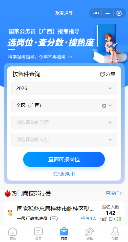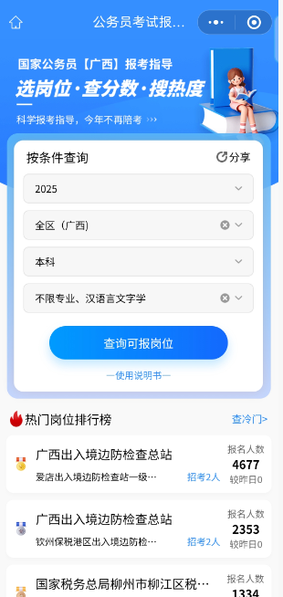 在這里,你能清晰查看各個(gè)崗位的系統熱度,官方報考人數、崗位報名條件,入面分數和錄取分數,這些數據都是經(jīng)過(guò)精準整理與分析的,能為你的選崗提供有力參考。