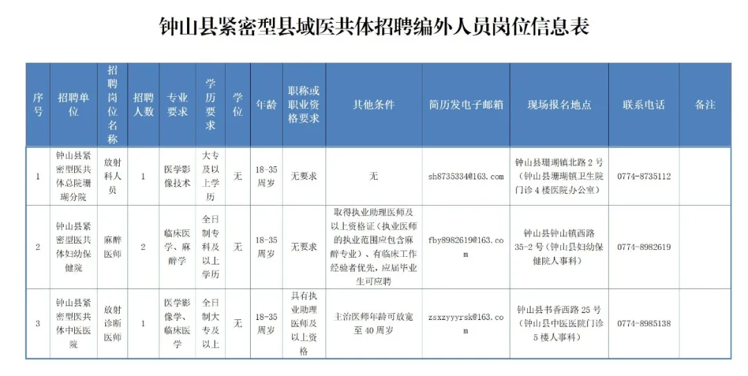本次招錄由鐘山縣緊密型醫共體總院珊瑚分院、鐘山縣緊密型醫共體婦幼保健院、鐘山縣緊密型醫共體中醫醫院按本院招錄臨聘人員相關(guān)制度、流程進(jìn)行。