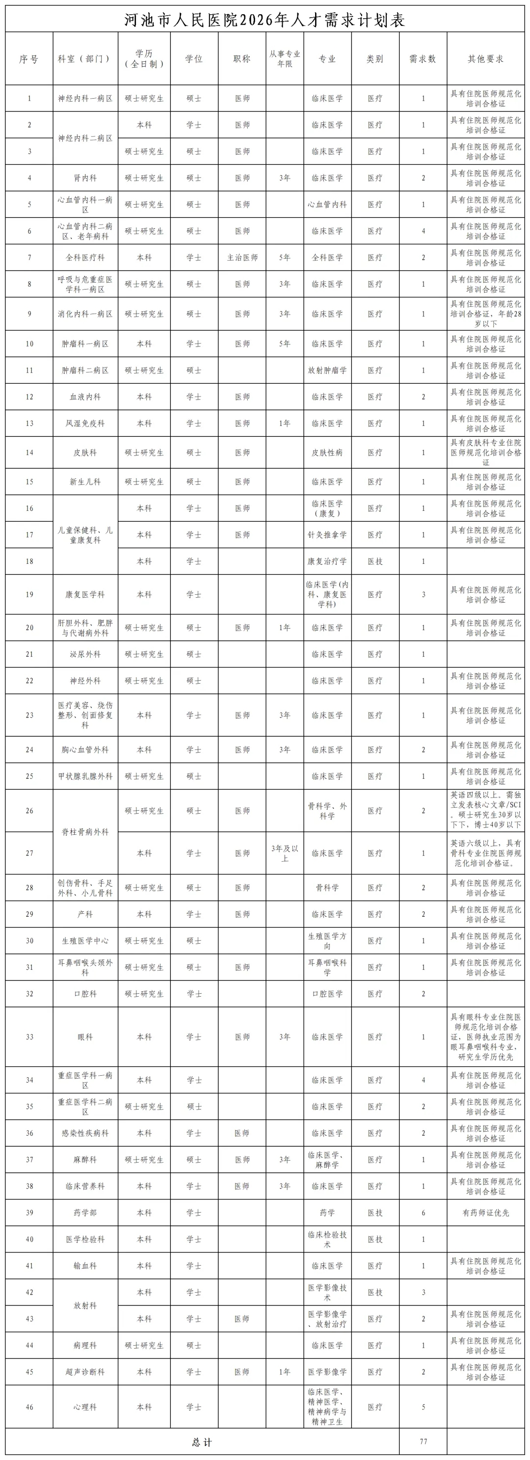 2026年河池市人民醫院人才招聘77人