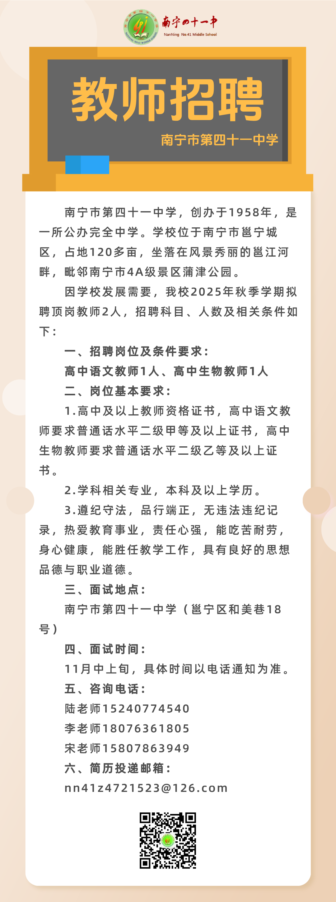 2025年秋季學(xué)期南寧市第四十一中學(xué)關(guān)于公開(kāi)招聘頂崗教師的啟事