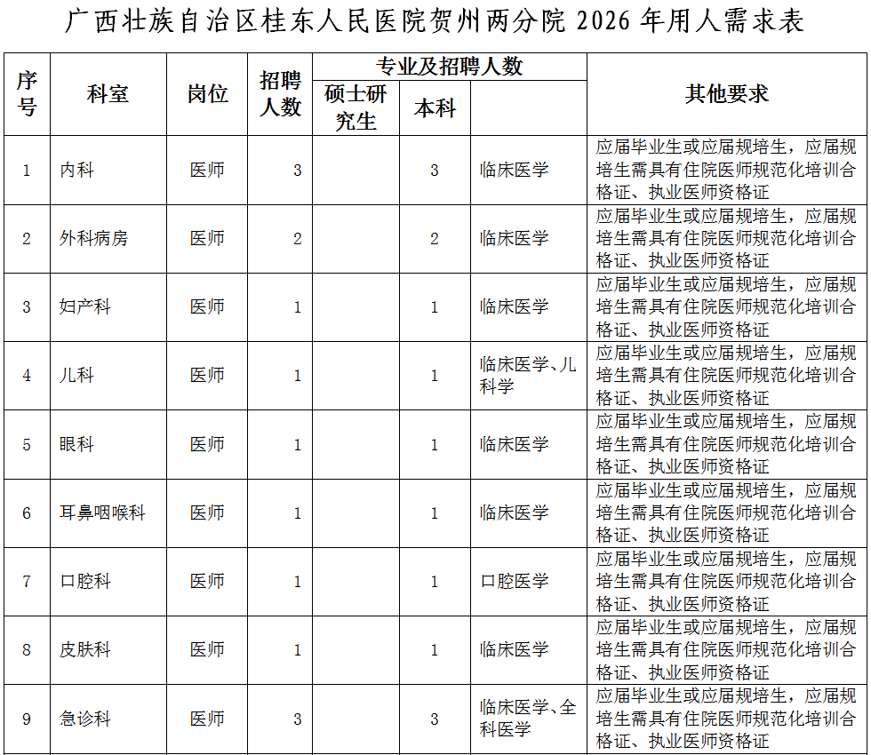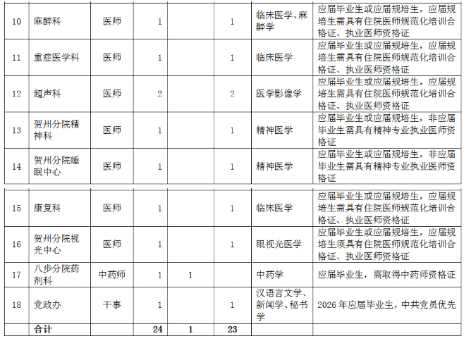 (應聘報名二維碼)同時(shí),按以下要求提供個(gè)人應聘材料(電子版)發(fā)電子郵箱:gdyy2817726@163.com(郵件主題請標明:“姓名+賀州兩分院”字樣)。應屆畢業(yè)生:個(gè)人簡(jiǎn)歷、身份證、就業(yè)推薦表、成績(jì)單、各種獎項獎勵證書(shū)、外語(yǔ)等級證書(shū)等。非應屆畢業(yè)生:個(gè)人簡(jiǎn)歷、身份證、畢業(yè)證、畢業(yè)證備案登記表、學(xué)位證、學(xué)位證備案登記表、職稱(chēng)證、執業(yè)證、住院醫師規范化培訓合格證、工作證明等。報名時(shí)所提交的申請材料必須真實(shí)、準確,因報名時(shí)提交的申請材料不真實(shí)、不完整或錯誤填寫(xiě)報名信息,造成資格審查、面試資格審查不通過(guò)的,后果由報名人員自行承擔。(2)資格審核。人事科依據招聘公告和用人需求規定的資格條件對應聘人員簡(jiǎn)歷進(jìn)行收集和資格初步審查,經(jīng)招聘工作領(lǐng)導小組審核后,確定符合崗位條件報名人員名單,由醫院人事科電話(huà)或短信通知符合條件人員。(3)考核??己斯P試和面試由人事科負責組織實(shí)施,協(xié)助部門(mén)為醫務(wù)部、護理部、科教科以及用人科室,紀律監督部門(mén)為監察室。逾期未參加則視為自愿放棄。(4)試工。通過(guò)考核的非應屆畢業(yè)應聘人員,須到醫院試工5天。試工不通過(guò),不予聘用。(5)體檢。體檢工作由廣西壯族自治區桂東人民醫院按照有關(guān)規定統一組織。體檢標準參照《廣西壯族自治區事業(yè)單位公開(kāi)招聘人員體檢通用標準(試行)》《廣西壯族自治區事業(yè)單位公開(kāi)招聘人員體檢操作手冊(試行)》執行。體檢不合格或隱瞞真實(shí)情況致使體檢結果失真的,不予聘用。因體檢不合格空缺崗位的,將按考核的綜合成績(jì),從高到低,順位補充體檢人員。(6)公示和聘用。對擬聘非應屆畢業(yè)應聘者在全院范圍內進(jìn)行公示,公示期為5個(gè)工作日,公示期滿(mǎn)無(wú)異議按程序辦理聘用手續。對公示有異議,經(jīng)核實(shí)影響聘用的,取消其聘用資格;對反映問(wèn)題難以核實(shí)的暫緩聘用,待核實(shí)清楚后按有關(guān)規定辦理。