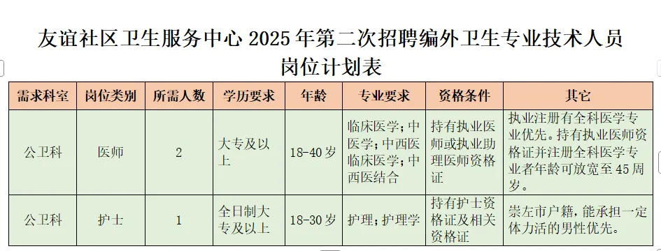 2.網(wǎng)上報名和現(xiàn)場報名。報名采取網(wǎng)上報名或現(xiàn)場報名均可。有意應(yīng)聘者填寫附件2《崇左市江州區(qū)友誼社區(qū)衛(wèi)生服務(wù)中心2025年招聘編外聘用衛(wèi)生專業(yè)技術(shù)人員報名表》,還需提供身份證、畢業(yè)證書、相關(guān)資格證復(fù)印件等相關(guān)材料,現(xiàn)場報名請到崇左市江州區(qū)友誼社區(qū)衛(wèi)生服務(wù)中心四樓辦公室(崇左市花山路33號),網(wǎng)上報名請將材料通過電子郵件(郵件請按格式命名:姓名+專業(yè)+應(yīng)該聘崗位+聯(lián)系電話)發(fā)送至中心辦公室郵箱:y1245630T@163.com。