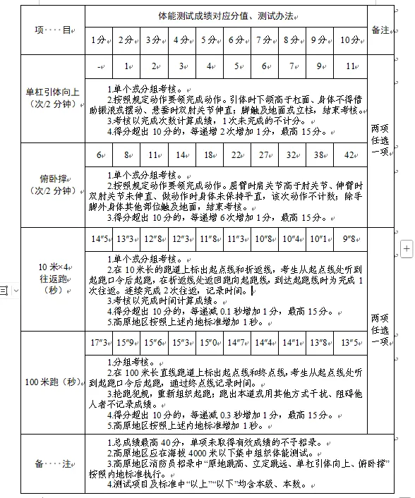 2.體能測試:(1)必考項目:1000米跑;(2)選考項目:①立定跳遠、原地跳高二選一;②單杠引體向上、俯臥撐二選一;③10米×4往返跑、100米跑二選一;(3)注意事項:體能測試有兩項及兩項以上不得分的視為不合格(標準參照附件)。未按時(shí)參加或因身體原因無(wú)法測試者,視為自動(dòng)放棄。