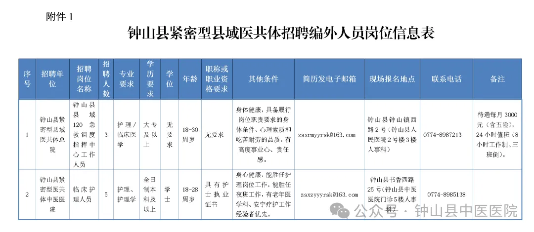 5.崗位具體信息及要求詳見(jiàn)附件1《鐘山縣緊密型縣域醫共體招聘編外人員崗位信息表》(如下圖)。