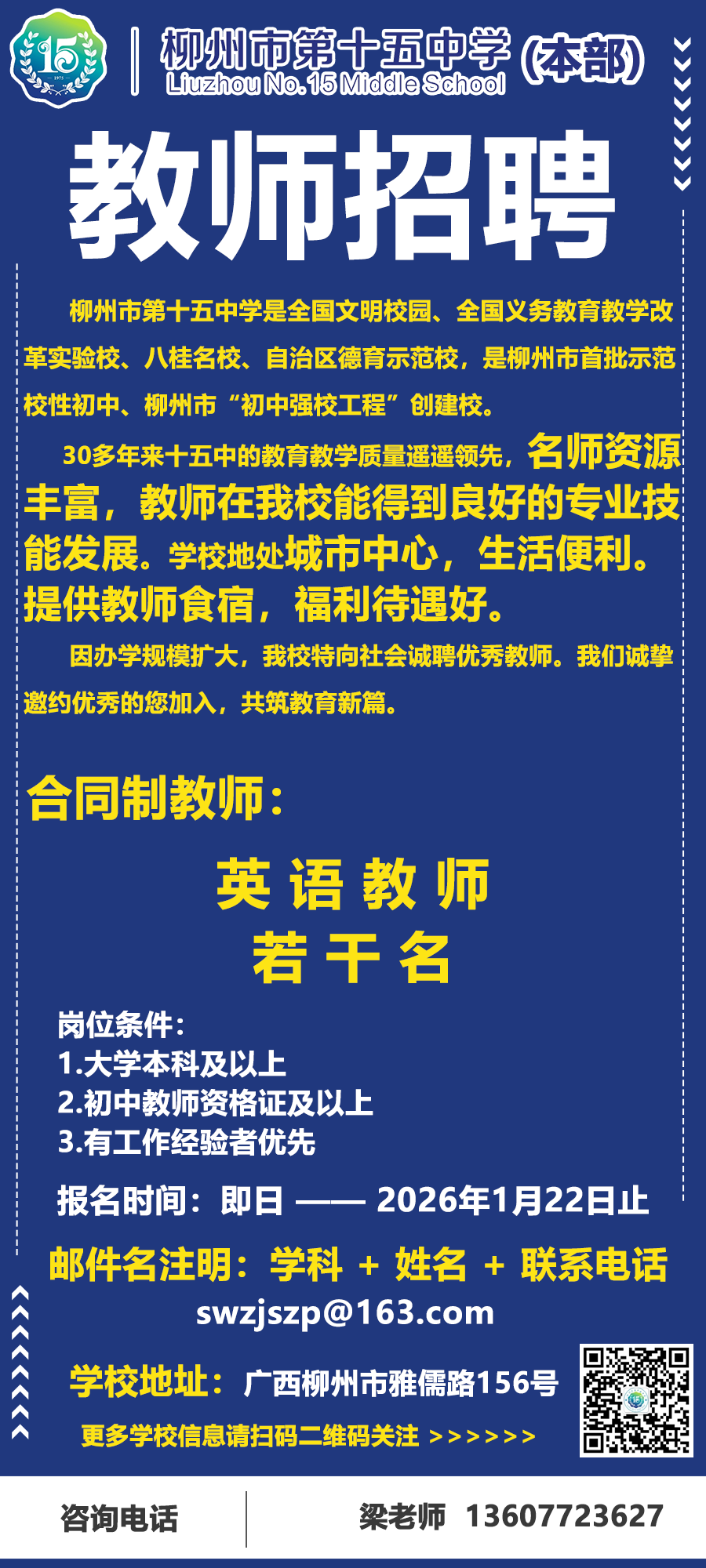 原文標題:柳州市第十五中學本部招聘公告