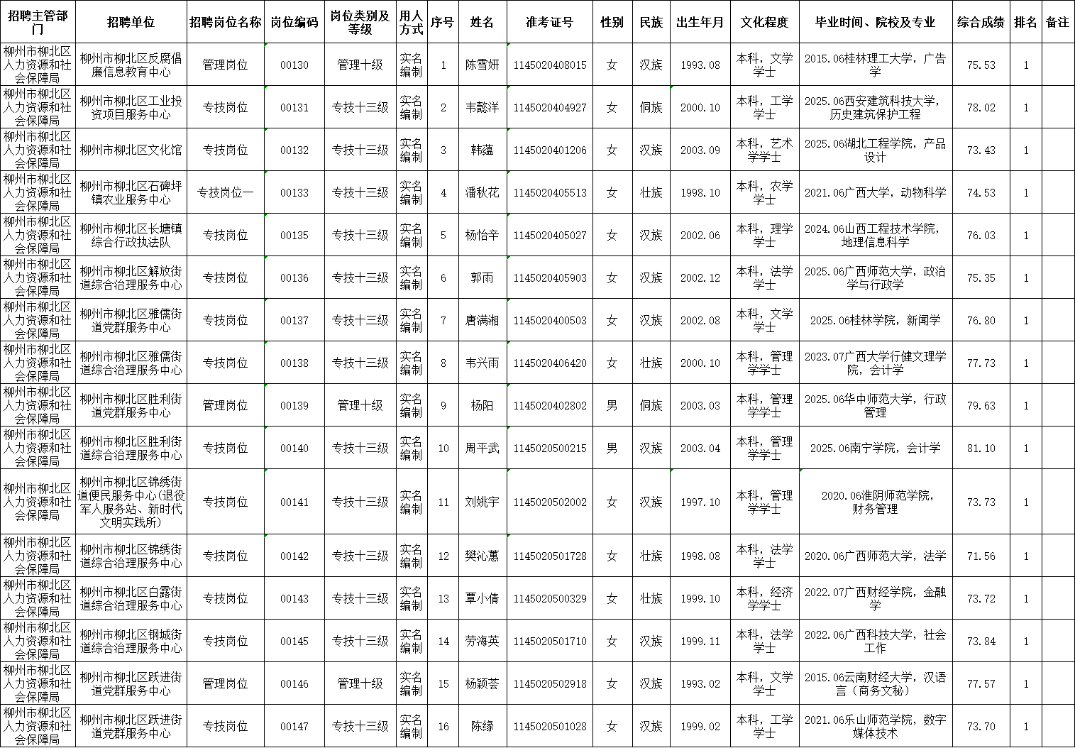 柳北區(qū)2025年度下半年事業(yè)單位公開考試招聘工作人員擬聘用人選公示(第一批)