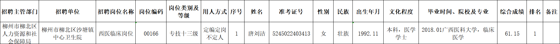 根據(jù)《柳州市2025年度下半年事業(yè)單位公開考試招聘工作人員公告》要求及安排,唐劉潔同志經(jīng)面試、考察、體檢合格,符合聘用條件。經(jīng)研究決定,擬聘用唐劉潔同志為我區(qū)事業(yè)單位工作人員,現(xiàn)予以公示,公示期為5個(gè)工作日(2026年1月22日至2026年1月28日)。對擬聘用的同志如有異議,請以書面形式,并署真實(shí)姓名和聯(lián)系地址,于2026年1月28日前郵寄或直接送我單位(地址:柳州市柳北區(qū)鷓鴣江六隊(duì)南200米(北外環(huán)路南)柳北區(qū)衛(wèi)生健康局512室;郵編:545002,電話0772-2802642),群眾如實(shí)反映有關(guān)問題受法律保護(hù)。