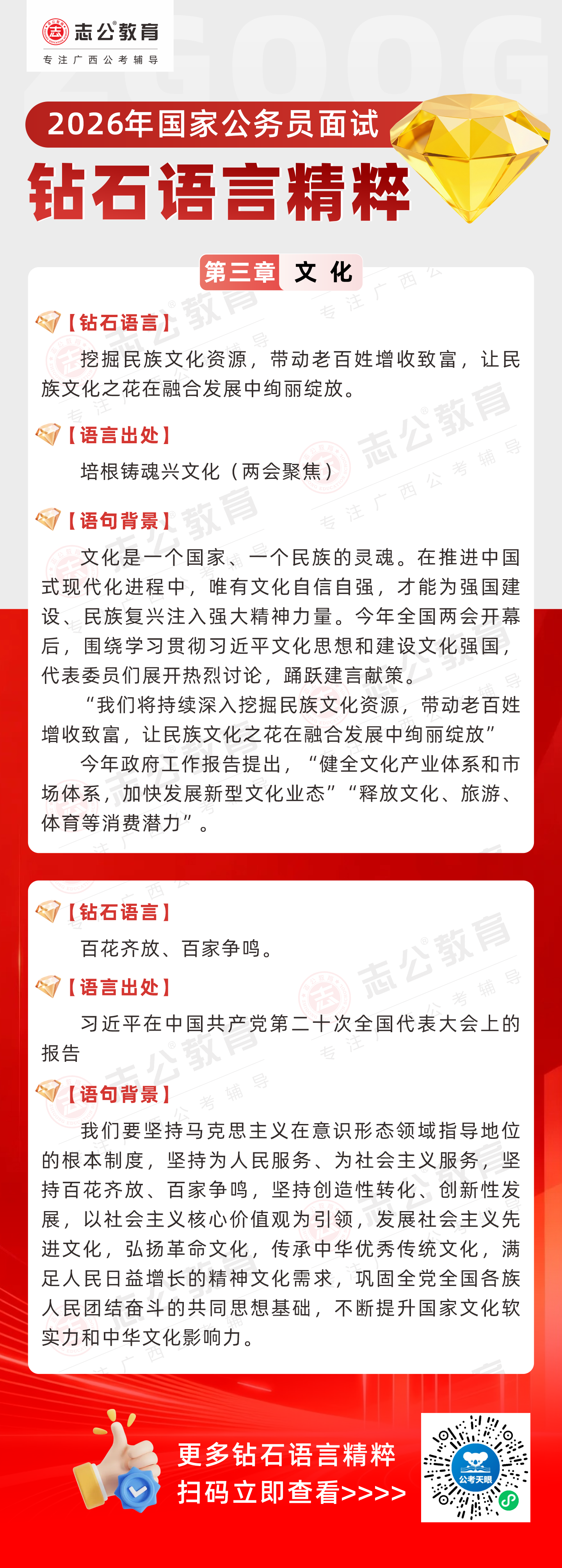 志公教育推出《2026國家公務(wù)員面試·鉆石語言精粹》文化篇!幫助考生把握文化類題目應(yīng)答邏輯,提升語言表達(dá)層次,助你在面試中脫穎而出。備考2026國考面試,從掌握“鉆石語言”開始!